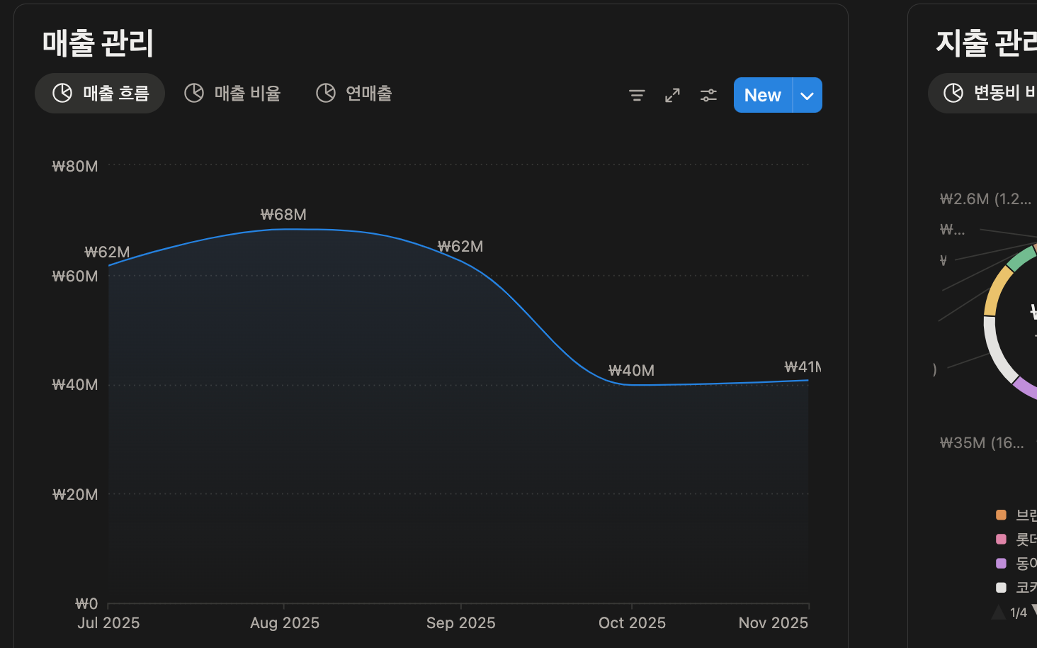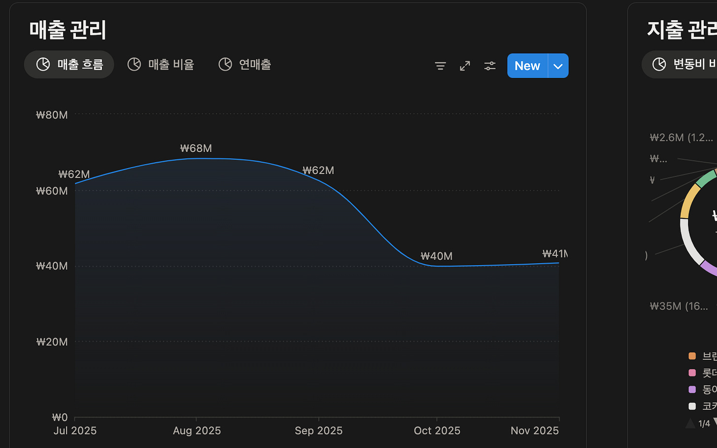 매달 인수한 두 커머스를 합쳐서 약 4,000~7,000만 원의 매출이 나오고 있습니다. 월마다 다르긴 하지만, 여기서 고정비랑 변동비 이것저것 다 빼면 10% 조금 덜 남습니다. 남은 현금의 대부분은 다시 재고 매입비로 들어갑니다.