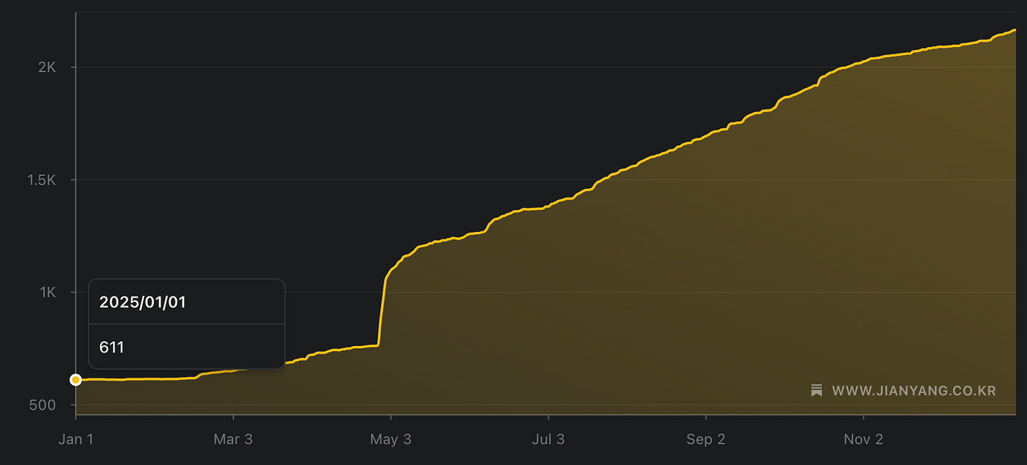 일단 ’주 1회 콘텐츠 발행’을 하면 어떻게 되는지 테스트를 했어요. 그전까지는 대략 2달에 한 편씩 자유롭게 쓰던 콘텐츠였는데, 2025년 3월 9일부터 매주 발행하겠다고 약속하고 한주도 안 거르고 올해 매주 발행했습니다.