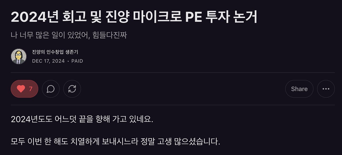 2024년 12월의 저는 사업을 하는 본질적인 이유에 대해서 고민을 하고 있었던 것 같네요. 2024년 한 해 동안 첫 사업체 인수와 양도를 경험했고, 그 과정을 통해서 ‘내가 왜 창업을 하는지’ 깊게 고민해볼 수 있던 시기였으니까요.