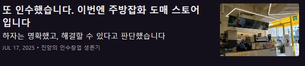 지금까지 내용을 종합해보면, 꾸준히 굴러가는 매출 위에 얹는 구조는 정말 사기적이다 라는 생각이 듭니다. 그래서 7번째 사업체 인수를 진행하려고 합니다!