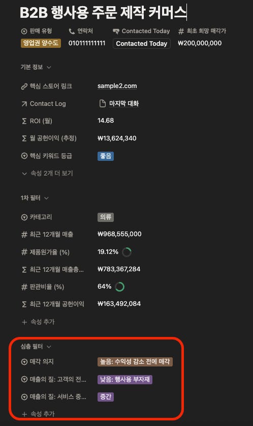 반면 2차(심층) 필터는 완전 다른 단계인데요, 뭔가 정답으로 딱 떨어지는 문제들은 아니고, ‘더 알아볼 가치가 있는지’를 판단하는 필터들이 많아요. 근데 결국 더 알아볼 가치가 있는지의 핵심 평가 요소는 두 가지입니다. 첫 번째는 매출의 질, 즉 매출의 인수 후 지속 가능성이고, 두 번째는 소유주의 매각 의지입니다.