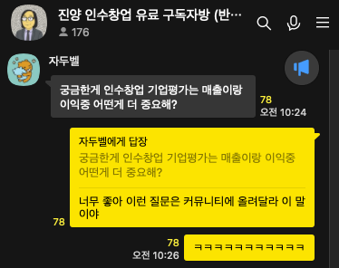 특히 최근 들어 강의에서 나오는 질문들이나 카톡방에서 오가는 질문들이 겹치면서, 아카이빙의 필요성을 느끼고 있습니다. 모든 질문과 관심이 진양 한 명 중심으로만 쏠리기 시작하면, 인수창업 생태계 자체가 생기기 어렵겠죠?