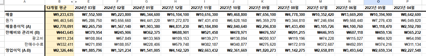 이 사업체를 봤을 당시, 최근 12개월 기준으로 월 평균 매출은 약 923만 원이었고, 총 12개월 매출 합계는 ₩110,803,620원(약 1.1억)이었습니다. 스마트스토어 외에는 다른 채널에서 판매하지 않고 있었으며, 광고비는 한 달에 10만 원도 채 쓰지 않는 상황이었죠.